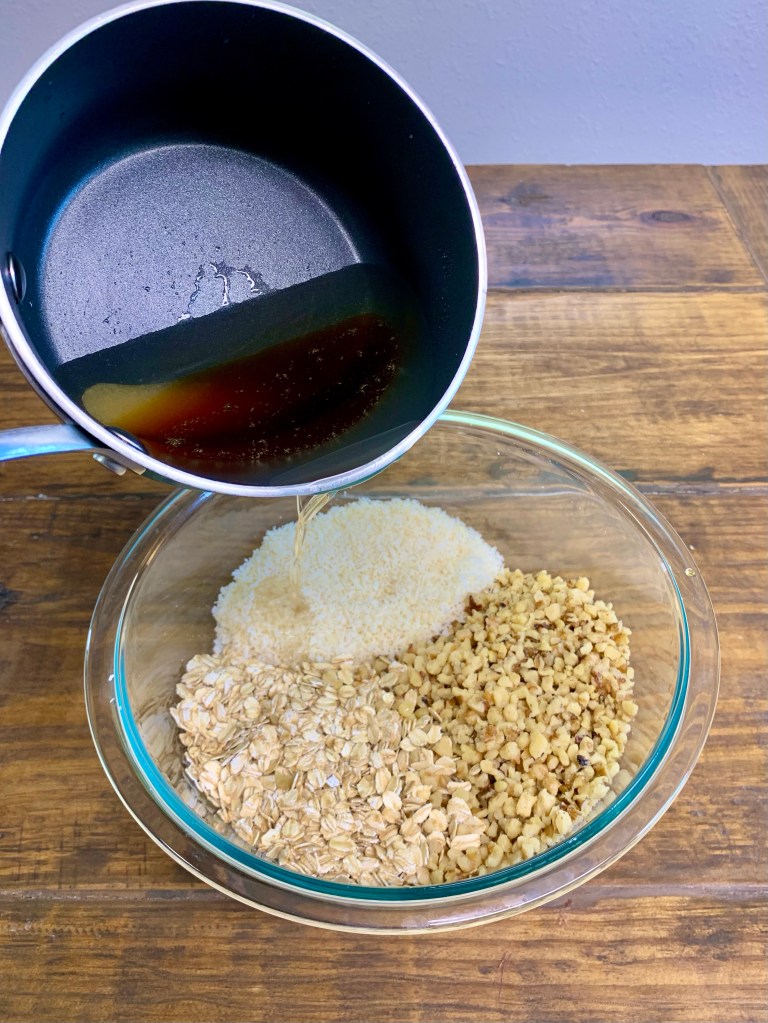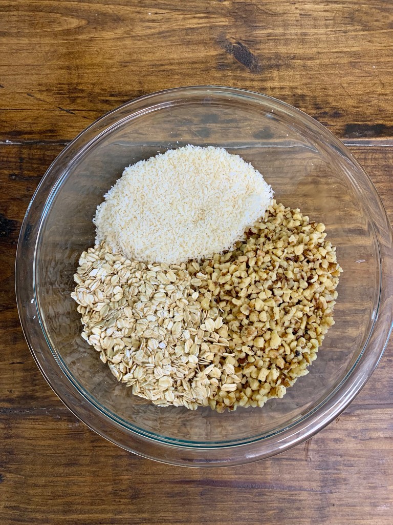 - Mix together nuts, oatmeal, and coconut.