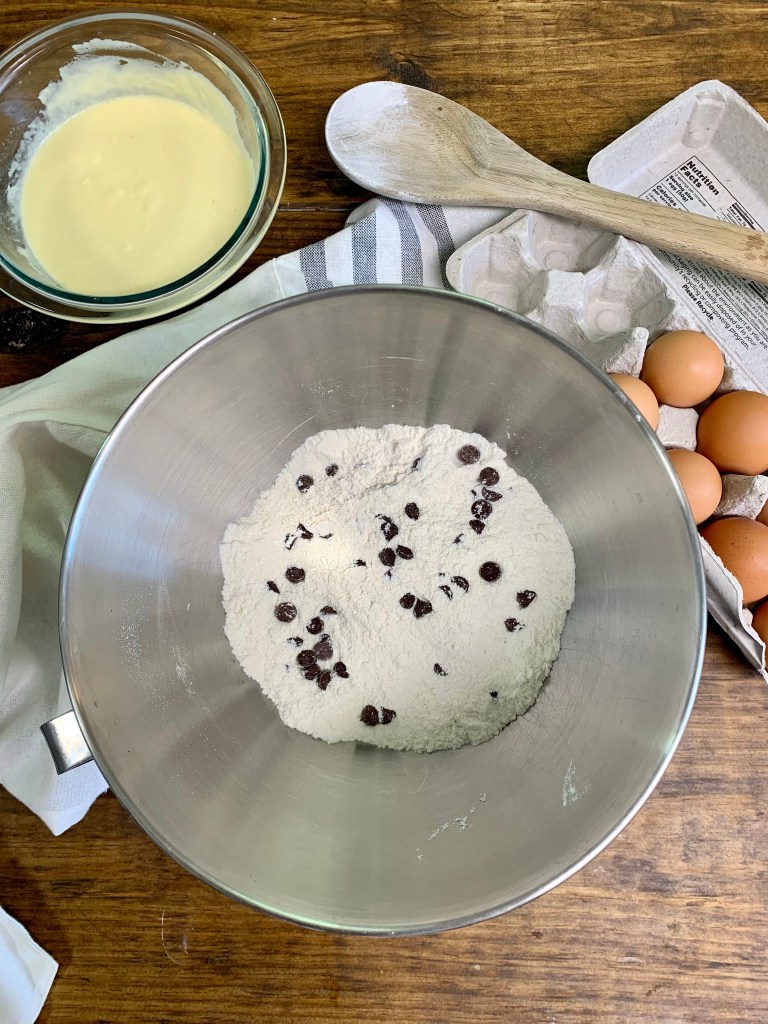 • Mix flour, sugar, salt, baking soda, baking powder, and cornstarch together. Then add in chocolate chips.