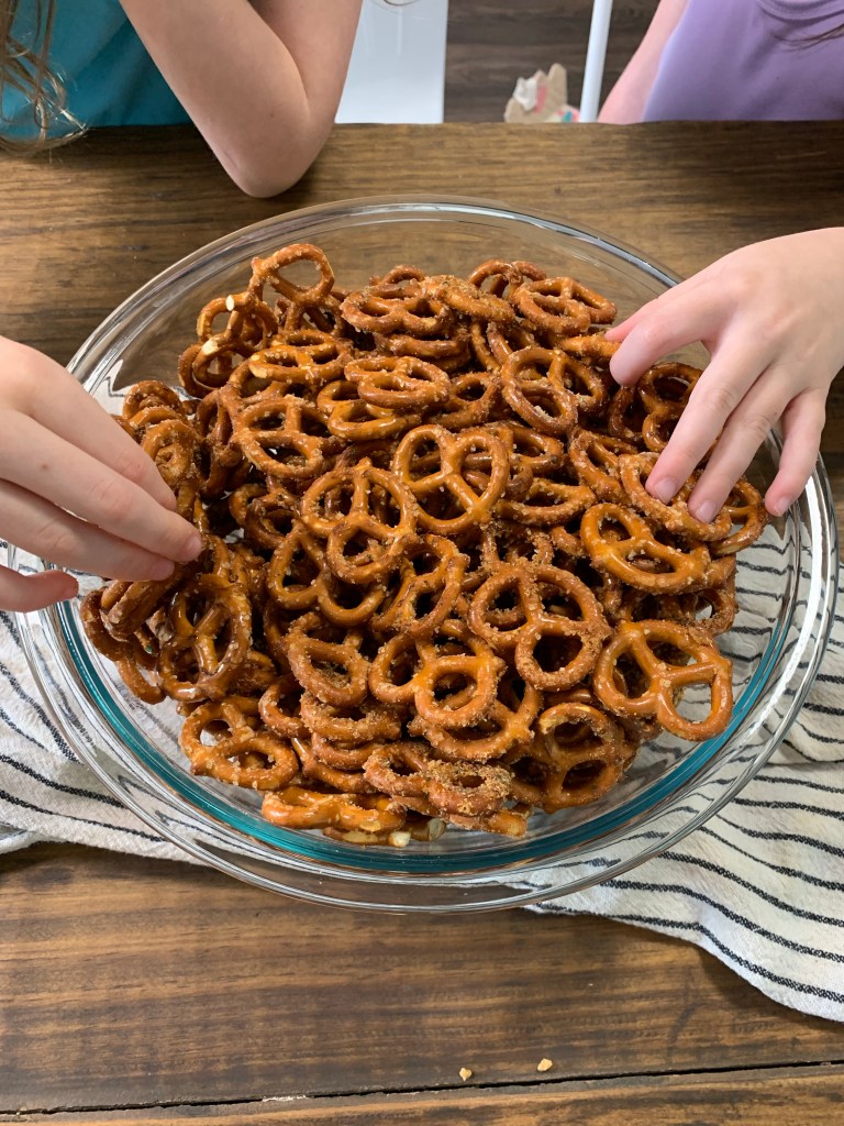 I feel like we wear out the same snacks by eating them over and over again. This leaves me searching for new recipes or ideas to feed this ravenous bunch. These garlic ranch pretzels have been a huge hit, and not only with the kids. We can put away these pretzels in a day or two. The fact that this recipe comes together with less than five minutes of prep and 15 minutes of cooking time makes it a favorite go-to of mine. They are as effortless as my Nothing Too Fancy Granola.