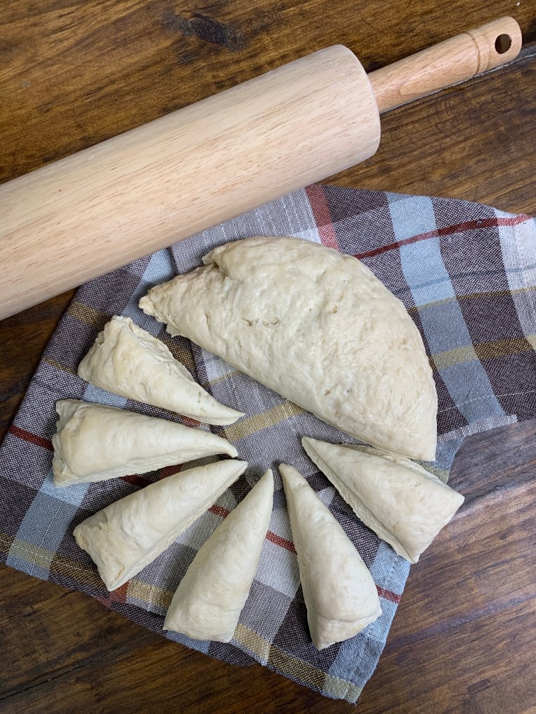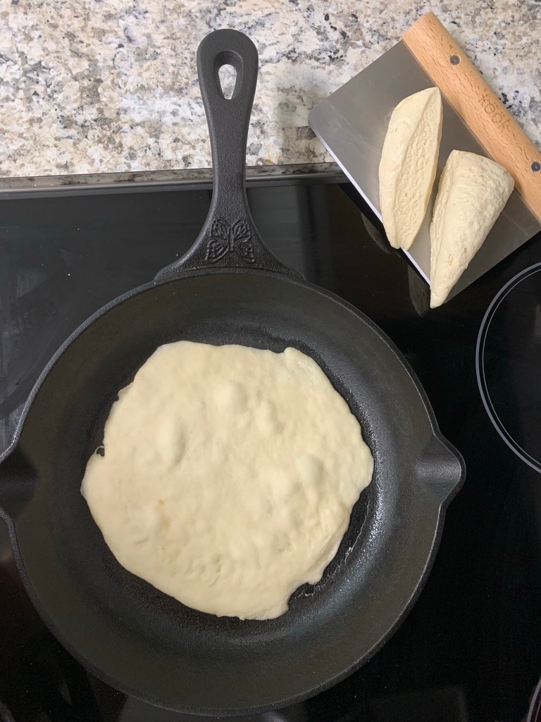 6. While your skillet is preheating, lightly flour your workspace and roll the dough into a circle using a rolling pin. Try and roll them out as thin as you can, because they will puff up a little as you cook them.