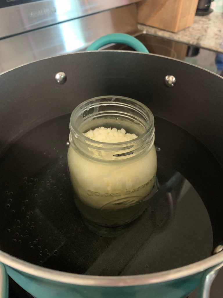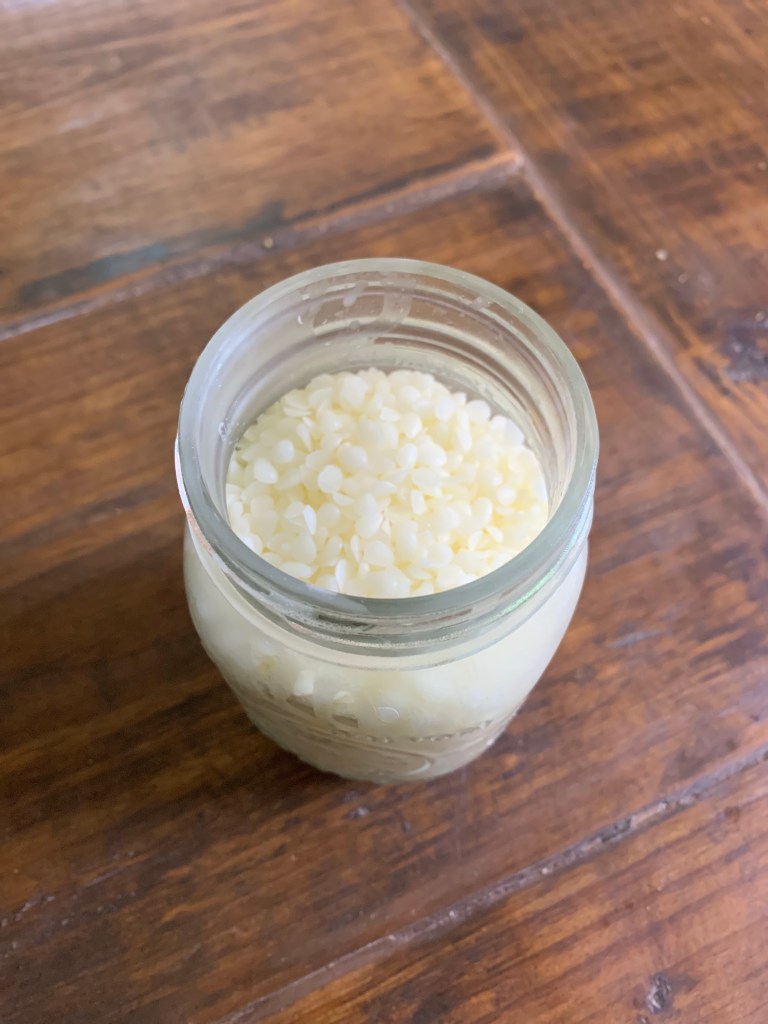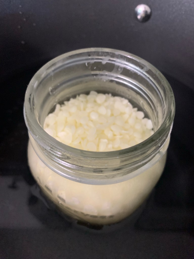 - Melt 1 cup of beeswax pellets and 1/4 cup of coconut oil in boiling water on the stove top.