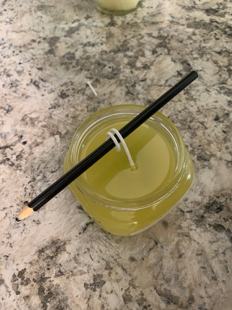 - Pour a small amount into the jar and position the cotton wick. Then proceed by pouring in the remaining amount. Wrap around a pencil to hold in place.