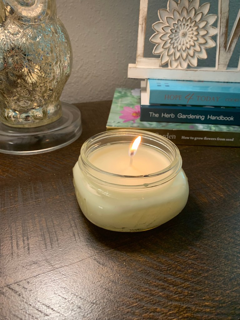 While candles do get a bad wrap sometimes, I have been missing the the glow of a candle lately. I really enjoy closing down the kitchen, and making breakfast preparations for the next day with my candle going in the background. The benefit to this candle is all the ingredients are all natural, so there is no need to worry about “extra” yucky stuff. The whole candle comes together rather quickly as well. You’ll be enjoying your own homemade essential oil candle in under an hour.