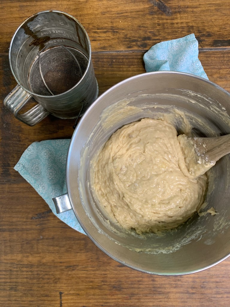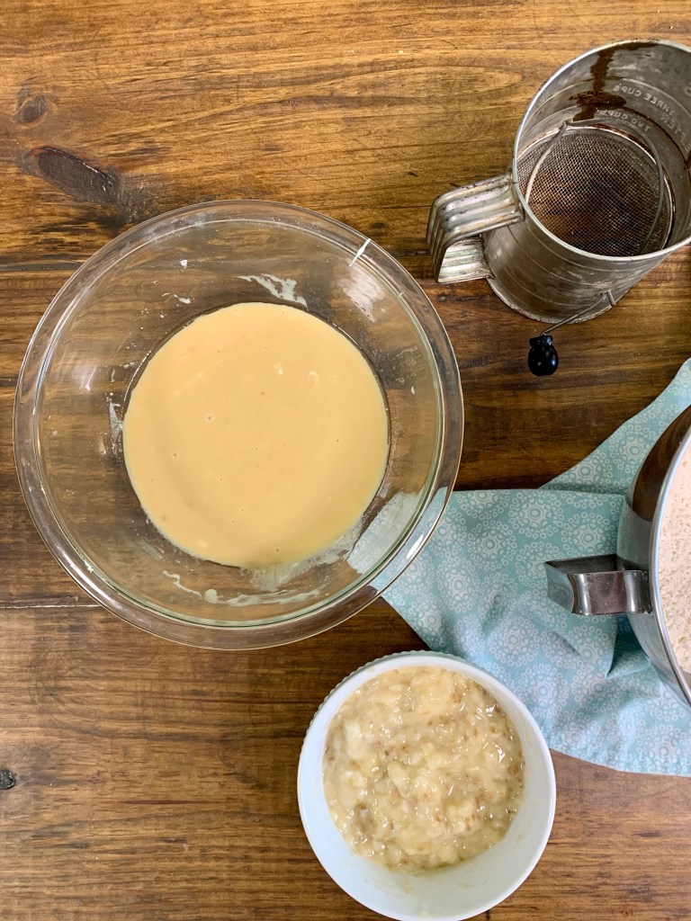 4. Using a spatula, mix together the sugar, oil, eggs, vanilla, and sourdough discard until creamy.