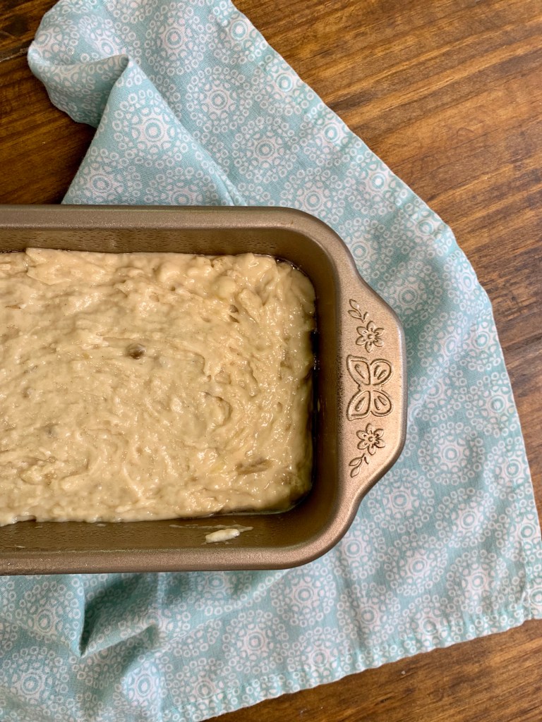 6. Spray a bread loaf pan with non-stick spray and pour the batter into the pan.