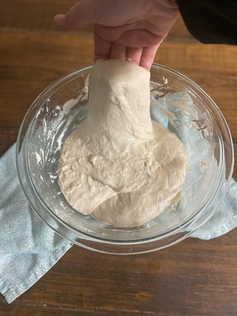 Grab the edge of one side of the dough, while still in the bowl, and gently pull up and fold across to the opposite side. Turn the bowl a quarter and repeat. Then two more times until you have moved around the bowl. This is one round of stretch and folds. You can wet the tips of your fingers with water if the dough is too sticky.