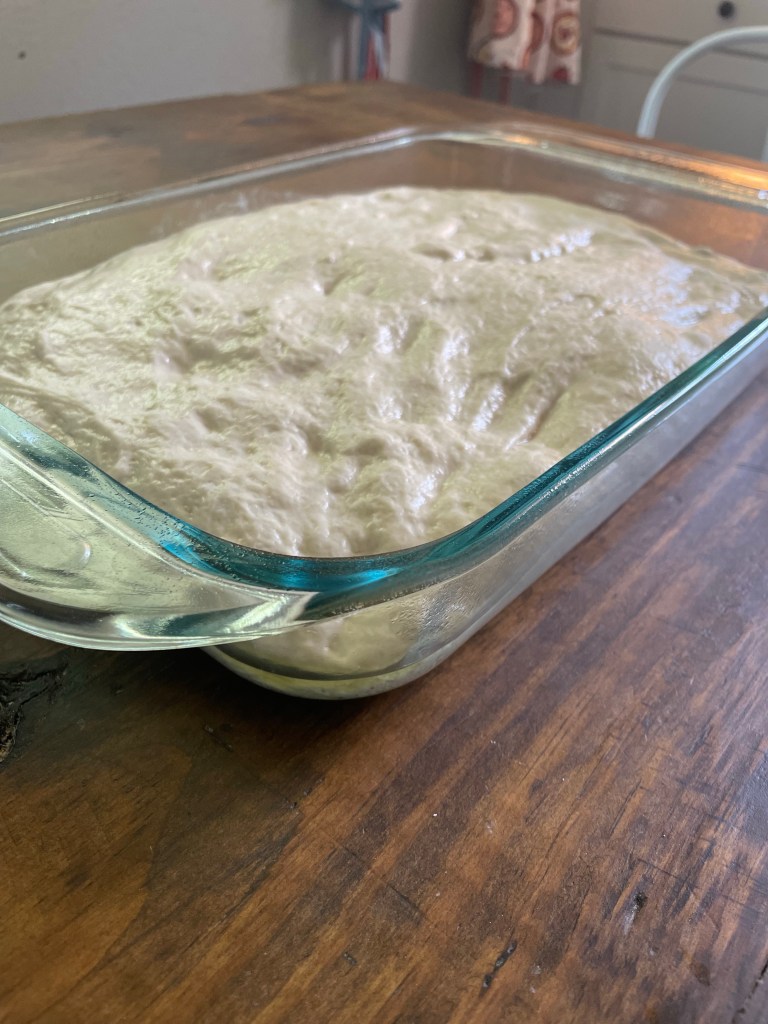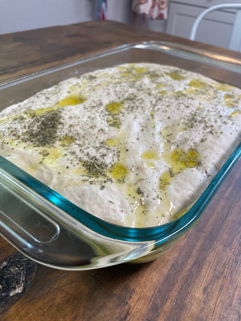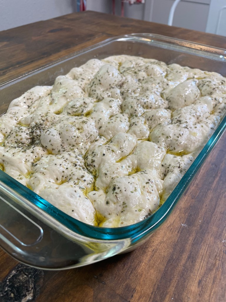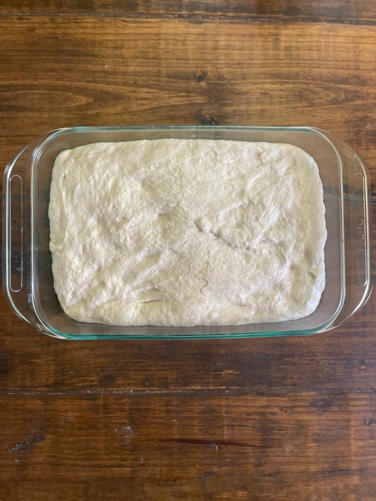 Lightly spray the bottom of your 9 x 13 baking pan. Then transfer the focaccia dough straight to the pan. Gently spreading out to fill the pan.