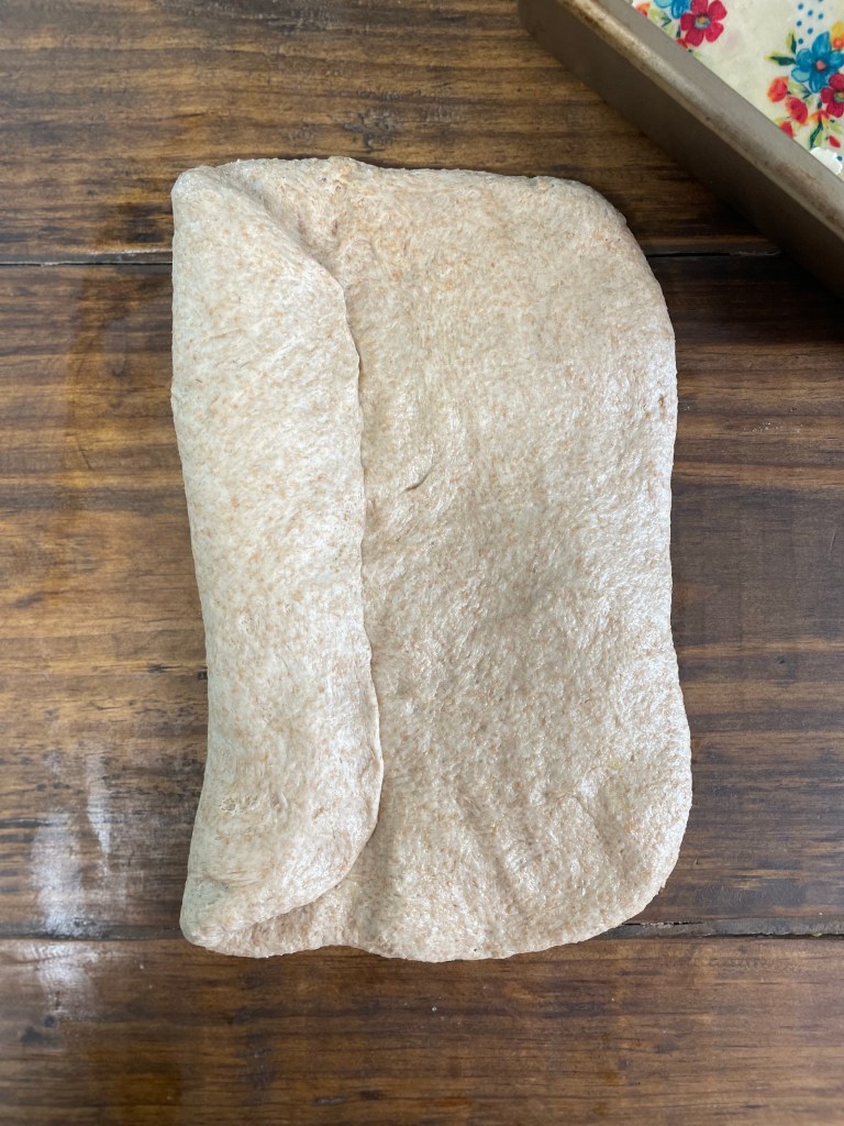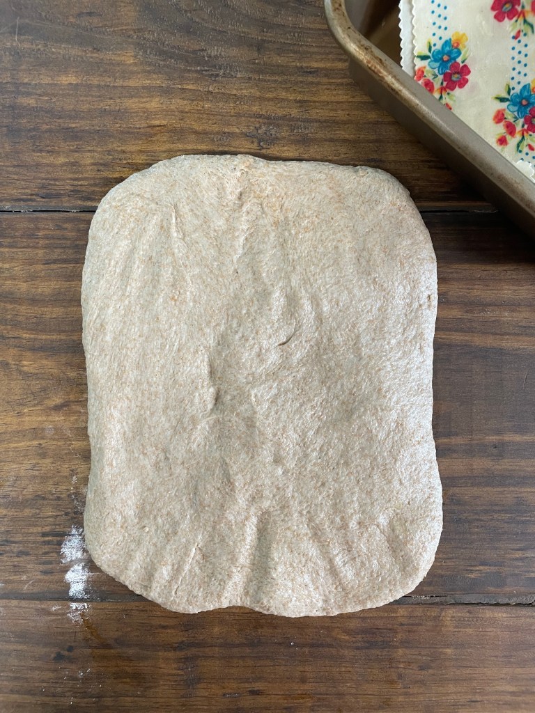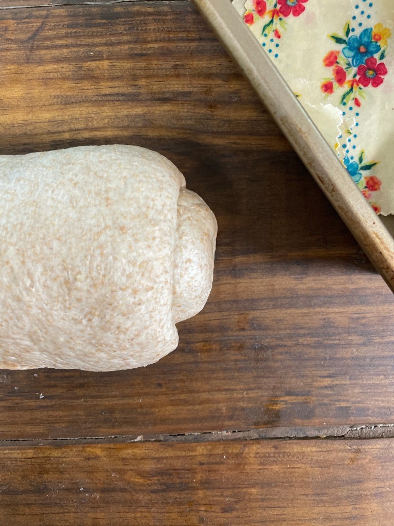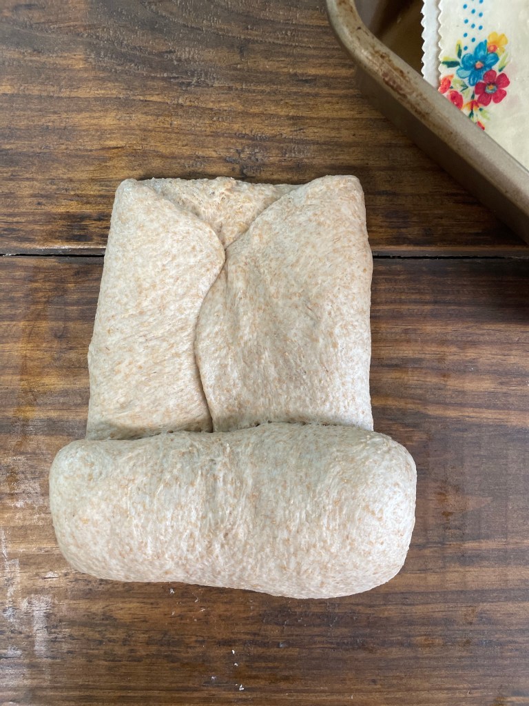 4. Punch the dough down. Roll the dough into a log shape and tuck in the sides. Place in a greased bread pan seam side down. Allow to rise an additional hour. The loaf should double in size and be at least one inch above the pan.